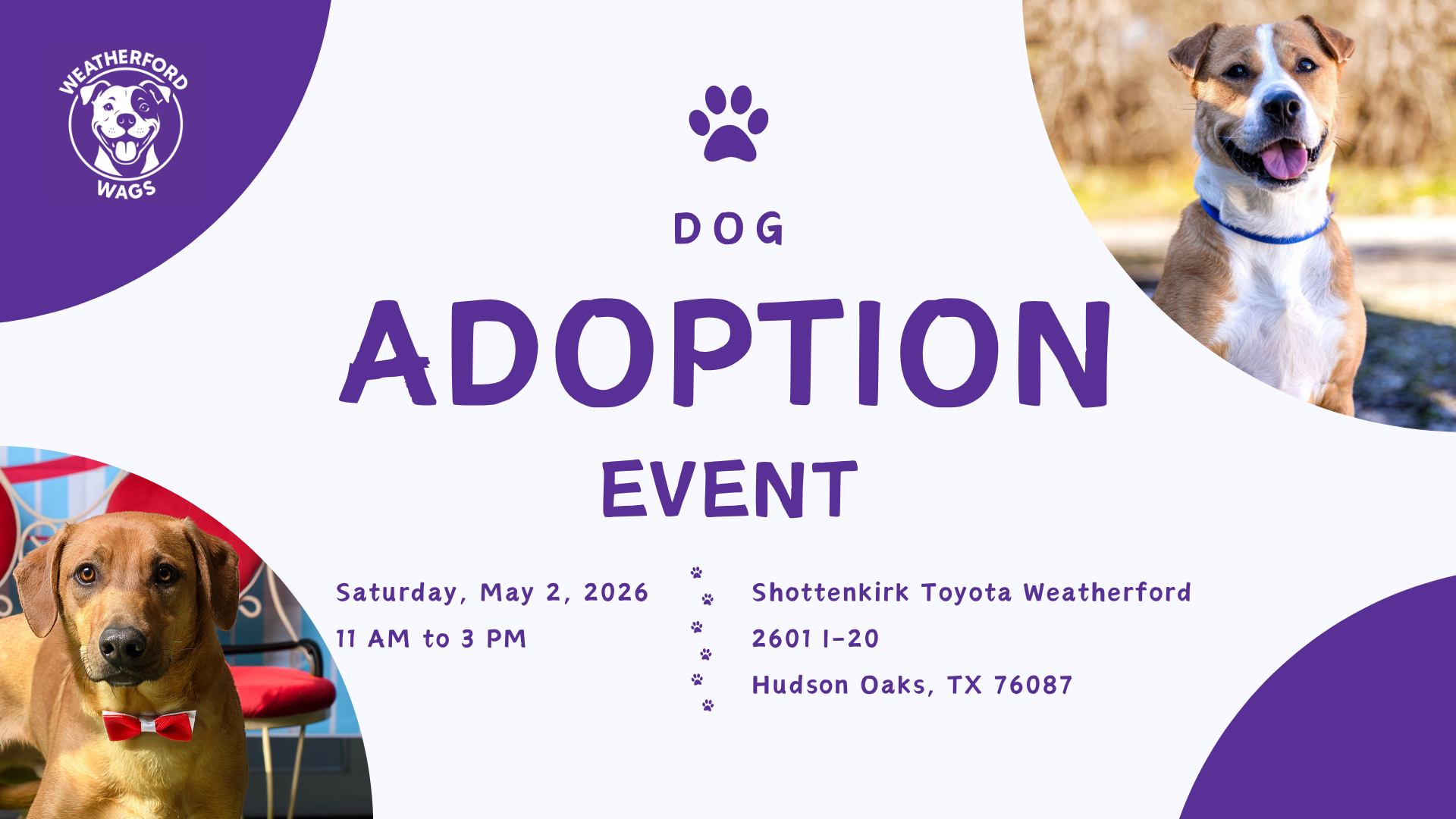 Ready to find your new best friend? Join Weatherford Wags for a special adoption event at Shottenkirk Toyota Weatherford on Saturday, May 2, 2026.